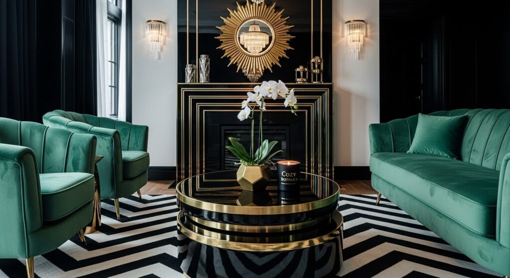 Key Elements: Distinguished by bold geometric patterns such as chevrons, sunbursts, and zig-zags, this style captures attention with its dramatic flair. Its hallmark features include high-contrast color palettes that create striking visual impacts, along with the use of opulent materials. Imagine sleek lacquered wood finishes, gleaming metals like brass and chrome that reflect light beautifully, and mirrored surfaces that amplify the sense of space. Rich, jewel-toned velvets lend a lavish touch, enhancing the overall feel of sophistication and decadence.